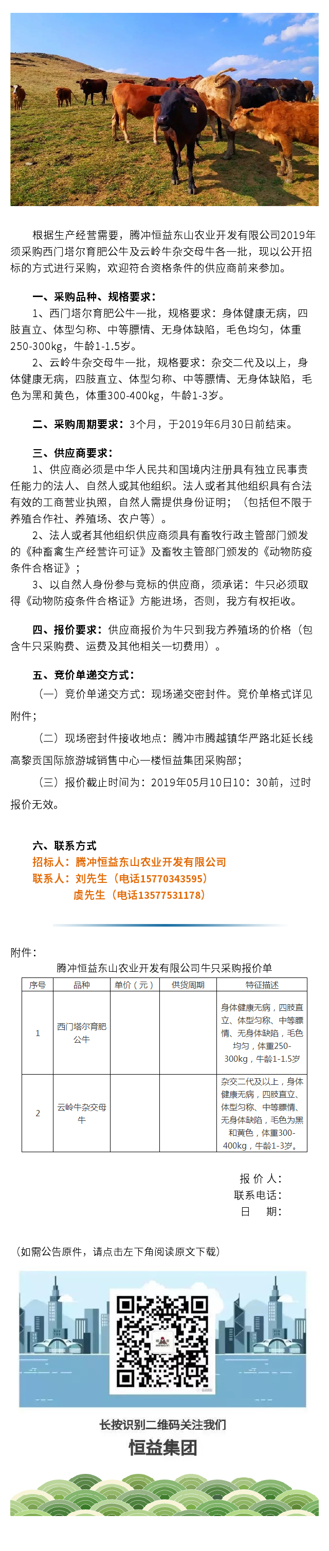 騰沖恒益東山農(nóng)業(yè)開(kāi)發(fā)有限公司牛只采購(gòu)競(jìng)價(jià)招標(biāo)公告 來(lái)源: 瀏覽量:9895 日期:2019-04-18 分享到: 上一篇:騰沖東山康養(yǎng)國(guó)際旅居小鎮(zhèn)學(xué)府雅苑智能安防系統(tǒng)工程施工招標(biāo)公告 下一篇:騰沖市恒益公司關(guān)于鋅精礦競(jìng)價(jià)銷售公告(201902)號(hào)