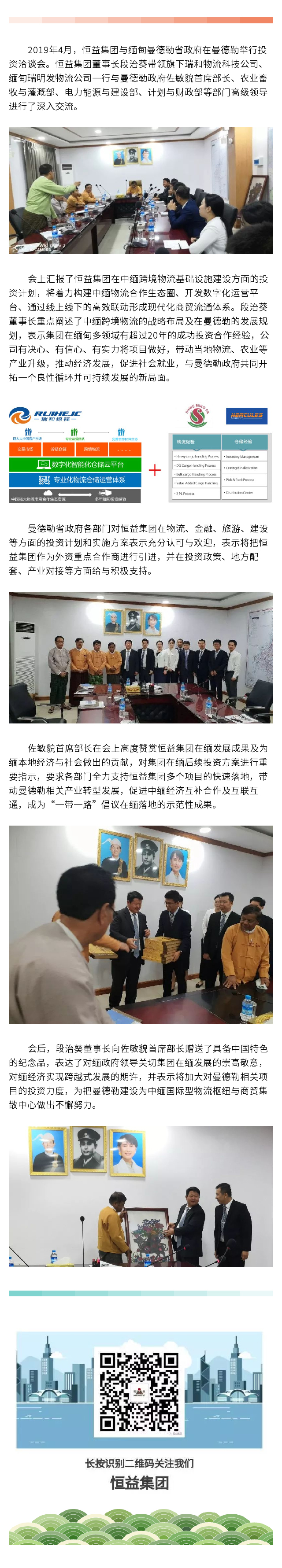 恒益集團董事長段治葵一行與緬甸曼德勒省政府舉行投資洽談 來源: 瀏覽量:9500 日期:2019-05-09 分享到: 上一篇:恒益集團組織召開戰(zhàn)略部署及強化內(nèi)部管理會議 下一篇:京東集團到訪恒益,達成農(nóng)牧業(yè)領(lǐng)域合作共識