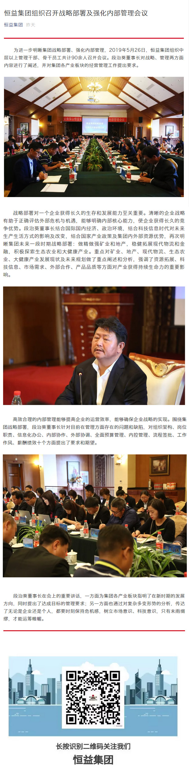 恒益集團(tuán)組織召開(kāi)戰(zhàn)略部署及強(qiáng)化內(nèi)部管理會(huì)議 來(lái)源: 瀏覽量:8135 日期:2019-05-27 分享到: 上一篇:恒益集團(tuán)遠(yuǎn)程會(huì)議統(tǒng)一通訊系統(tǒng)成功落地實(shí)施 下一篇:恒益集團(tuán)董事長(zhǎng)段治葵一行與緬甸曼德勒省政府舉行投資洽談