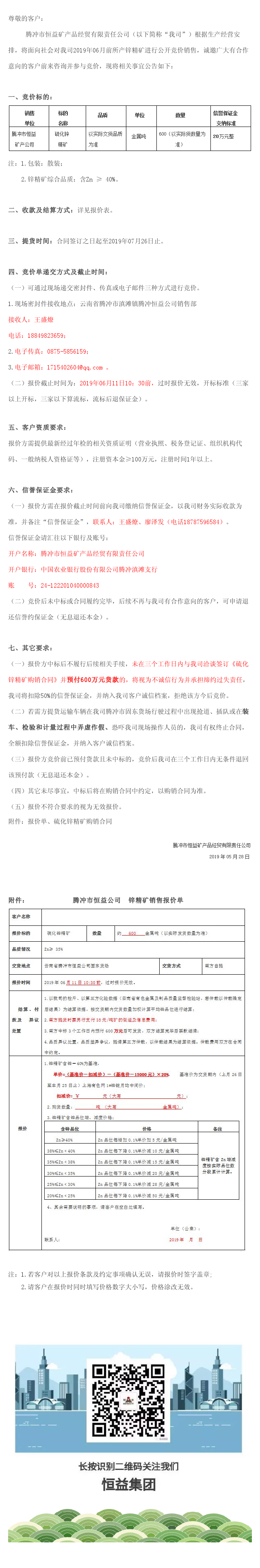 騰沖市恒益礦產(chǎn)品經(jīng)貿(mào)公司關(guān)于鋅精礦競(jìng)價(jià)銷售公告(201904)號(hào) 來(lái)源: 瀏覽量:9351 日期:2019-05-28 分享到: 上一篇:高黎貢國(guó)際健康旅居小鎮(zhèn)低層住宅八組團(tuán)-江山小院精裝樣板房裝修施工工程招標(biāo)公告 下一篇:騰沖市恒益礦產(chǎn)品經(jīng)貿(mào)公司關(guān)于鋅精礦競(jìng)價(jià)銷售公告(201903)號(hào)