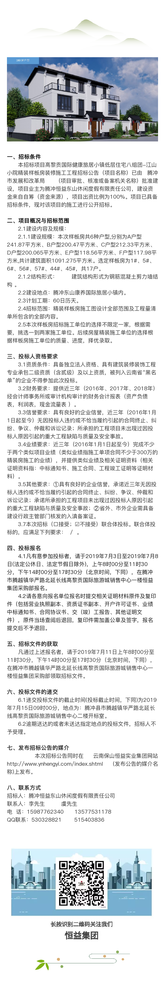 高黎貢國際健康旅居小鎮(zhèn)低層住宅八組團-江山小院精裝樣板房裝修施工工程招標(biāo)公告 來源: 瀏覽量:10330 日期:2019-07-04 分享到: 上一篇:高黎貢國際健康旅居小鎮(zhèn)低層住宅八組團—江山小院門頭及圍墻工程招標(biāo)公告 下一篇:騰沖市恒益礦產(chǎn)品經(jīng)貿(mào)公司關(guān)于鋅精礦競價銷售公告(201904)號