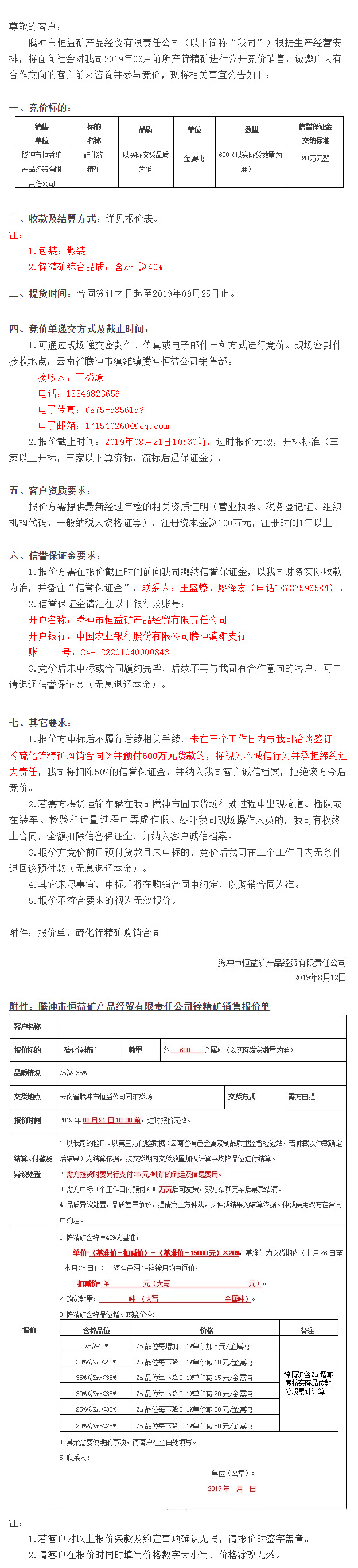 騰沖市恒益礦產(chǎn)品經(jīng)貿(mào)有限責(zé)任公司關(guān)于鋅精礦競價銷售公告(201905)號 來源: 瀏覽量:10233 日期:2019-08-13 分享到: 上一篇:騰沖市恒益礦產(chǎn)品經(jīng)貿(mào)有限責(zé)任公司關(guān)于鋅精礦競價銷售公告(201905)號 下一篇:高黎貢國際健康旅居小鎮(zhèn)低層住宅八組團—江山小院門頭及圍墻工程招標(biāo)公告