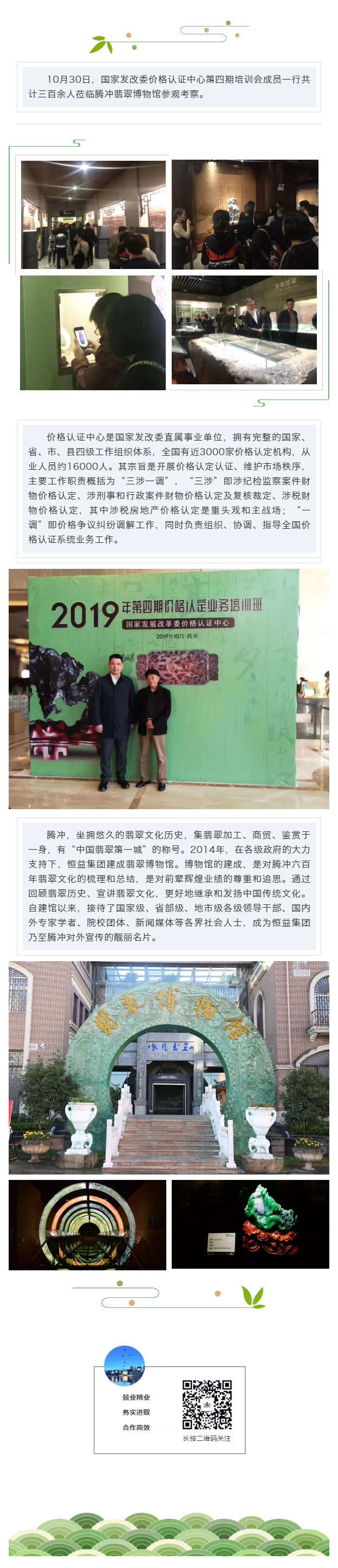 國(guó)家發(fā)改委價(jià)格認(rèn)證中心第四期培訓(xùn)會(huì)成員參觀考察騰沖翡翠博物館 來(lái)源: 瀏覽量:7998 日期:2019-11-01 分享到: 上一篇:中國(guó)地質(zhì)大學(xué)(武漢)王焰新校長(zhǎng)一行蒞臨翡翠博物館參觀考察 下一篇:蒙古第八批高中級(jí)領(lǐng)導(dǎo)干部考察團(tuán)蒞臨高黎貢文化創(chuàng)意產(chǎn)業(yè)園區(qū)參觀考察