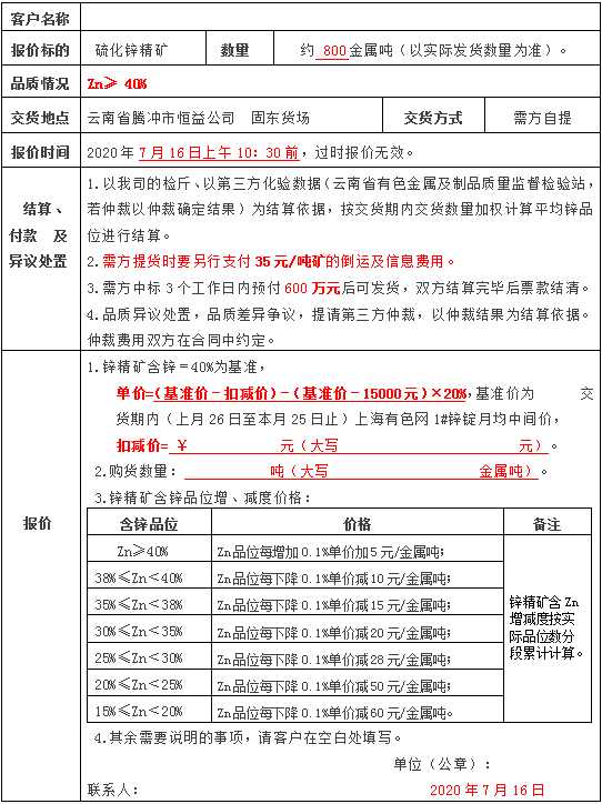 附件:騰沖市恒益礦產(chǎn)品經(jīng)貿(mào)有限責(zé)任公司鋅精礦銷售報(bào)價(jià)單