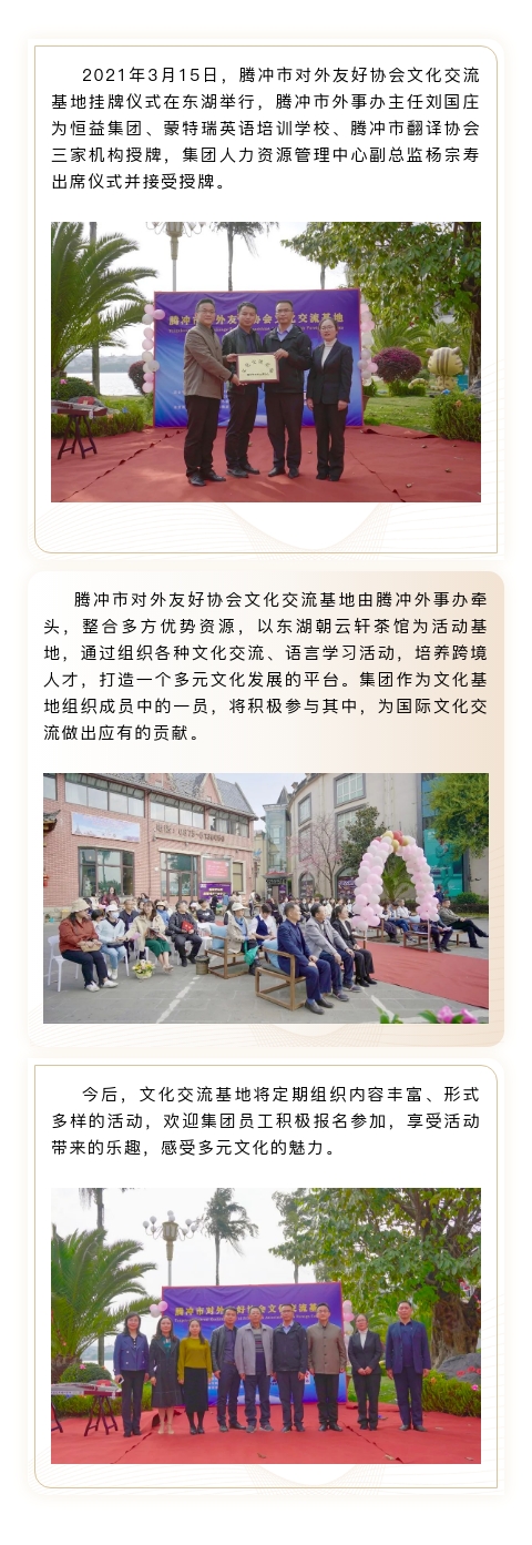 恒益集團(tuán)掛牌“騰沖市對(duì)外友好協(xié)會(huì)文化交流基地” 來(lái)源: 瀏覽量:6984 日期:2021-03-16 分享到: 上一篇:爛刺溝尾礦庫(kù)驗(yàn)收公示內(nèi)容 下一篇:“東山之下,原創(chuàng)詩(shī)歌、散文分享會(huì)”在東山書院隆重舉行