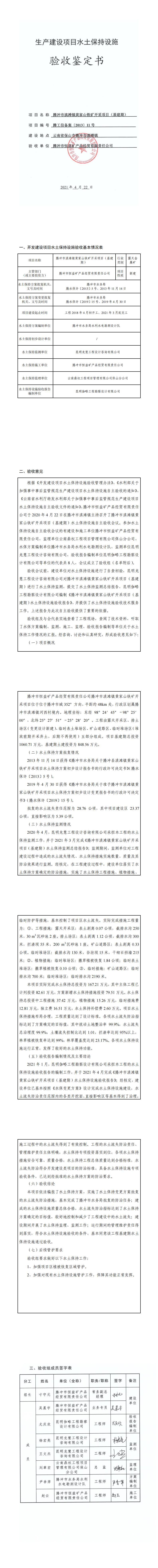1. 騰沖市滇灘鎮(zhèn)黃家山鐵礦開采項(xiàng)目(基建期)水土保持設(shè)施驗(yàn)收鑒定書