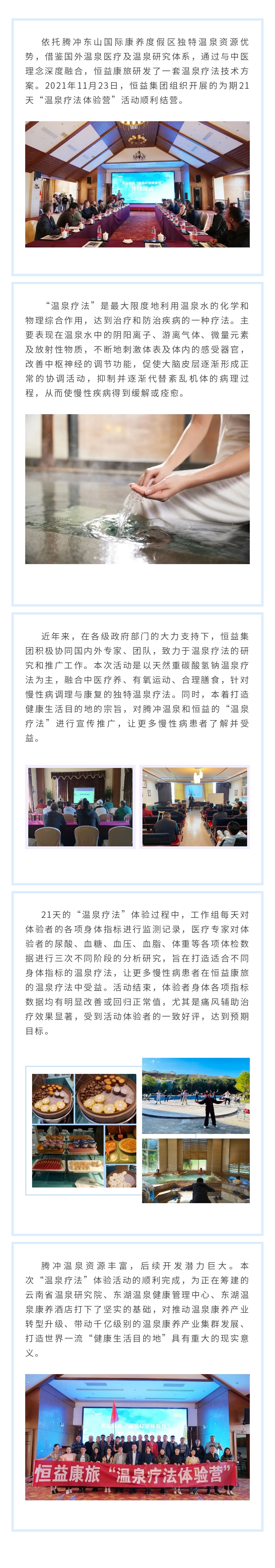 恒益康旅“溫泉療法體驗營”活動順利結營 來源: 瀏覽量:6487 日期:2021-12-01 分享到: 上一篇:政校企共建云南省溫泉研究院簽約儀式成功舉辦 下一篇:“云南省騰沖市中藥材產業(yè)科技特派團” 項目第二次會議順利召開,助力騰沖中藥材產業(yè)發(fā)展
