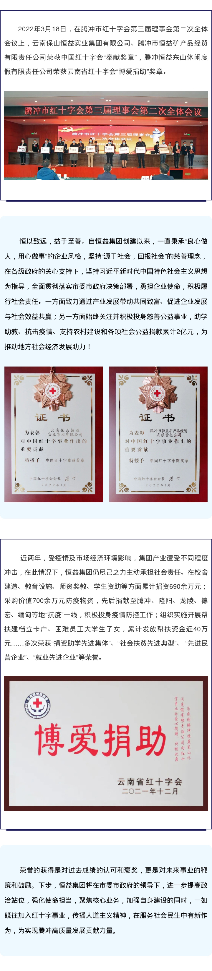 恒益集團(tuán)三家公司榮獲紅十字會(huì)表彰 來(lái)源: 瀏覽量:5992 日期:2022-03-21 分享到: 上一篇:欲明其流,必溯其源——騰沖翡翠博物館組織召開(kāi)“馬玉石”專題研討會(huì) 下一篇:校企合作,共推溫泉康養(yǎng)產(chǎn)業(yè)發(fā)展