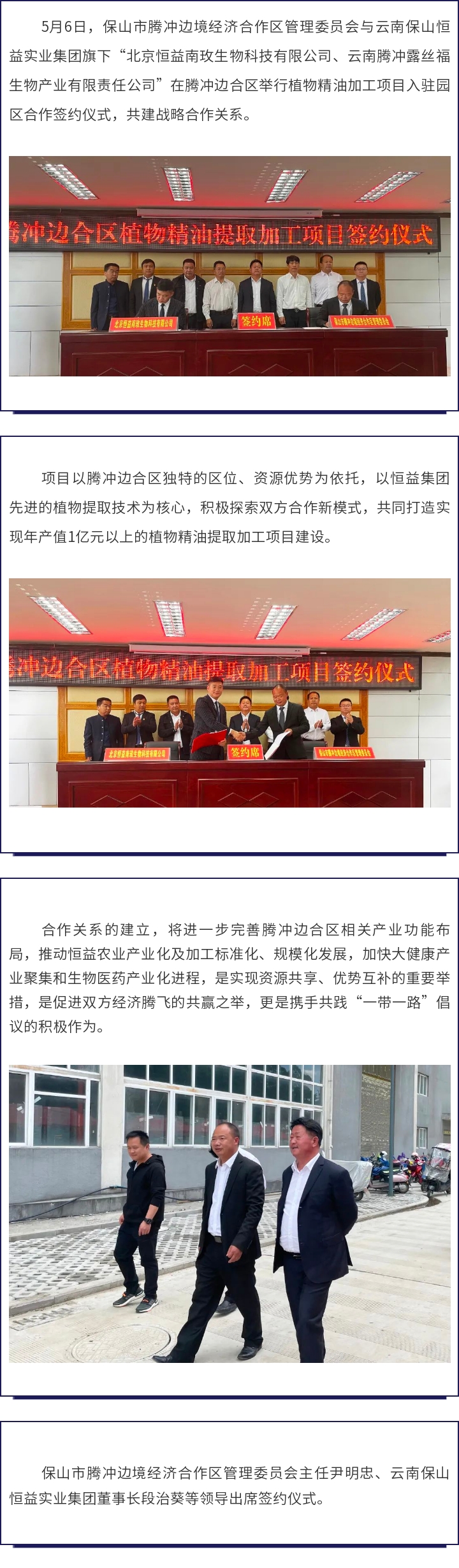 保山市騰沖邊境經(jīng)濟(jì)合作區(qū)管理委員會(huì)與云南保山恒益實(shí)業(yè)集團(tuán)簽訂項(xiàng)目合作協(xié)議 來(lái)源: 瀏覽量:6225 日期:2022-05-07 分享到: 上一篇:奮力拼搏展風(fēng)采,攜手同心創(chuàng)佳績(jī) 下一篇:博學(xué)于文,約之以禮——恒益集團(tuán)組織“國(guó)賓禮儀”主題專場(chǎng)培訓(xùn)