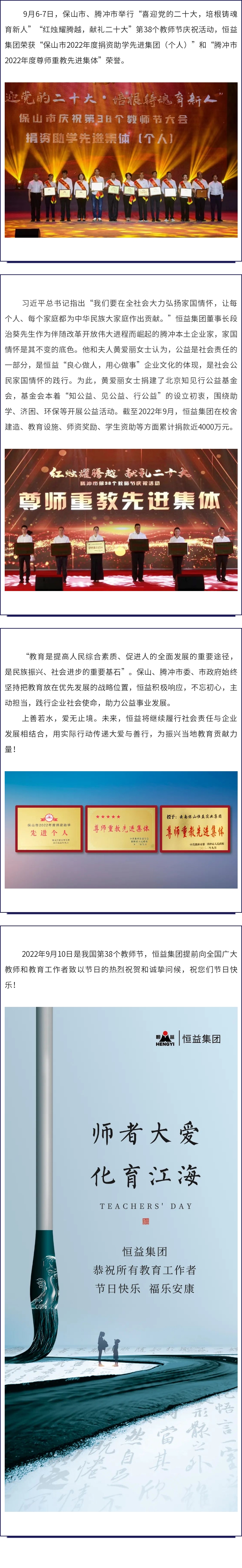 喜訊│恒益集團榮獲捐資助學、尊師重教先進集體(個人) 來源: 瀏覽量:5611 日期:2022-09-09 分享到: 上一篇:恒益集團組織開展新聞寫作專題培訓 下一篇:知見行公益基金會聯(lián)合恒益集團向騰沖市八所學校捐贈230萬元獎教金