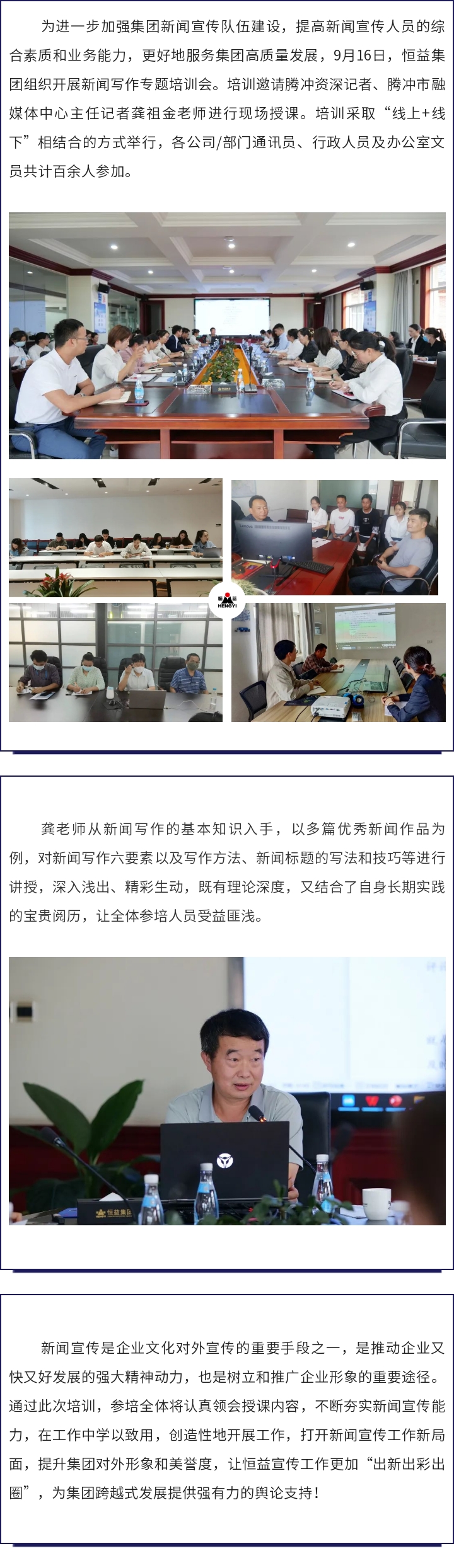 恒益集團(tuán)組織開展新聞寫作專題培訓(xùn) 來(lái)源: 瀏覽量:5527 日期:2022-09-20 分享到: 上一篇:校企合作譜新篇,協(xié)同育人共發(fā)展 下一篇:喜訊│恒益集團(tuán)榮獲捐資助學(xué)、尊師重教先進(jìn)集體(個(gè)人)