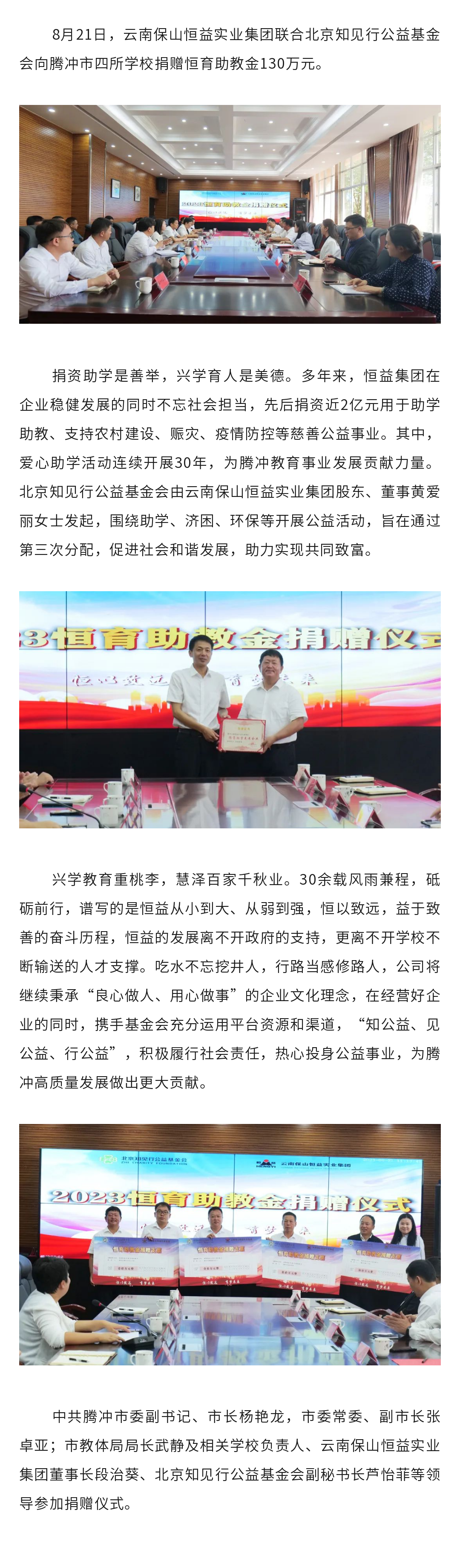 恒益聯(lián)合知見行公益基金會向騰沖市四所學(xué)校捐贈130萬元恒育助教金 來源: 瀏覽量:5477 日期:2023-08-21 分享到: 上一篇:沒有了 下一篇:喜訊│恒益集團榮獲捐資助學(xué)、尊師重教先進集體(個人)