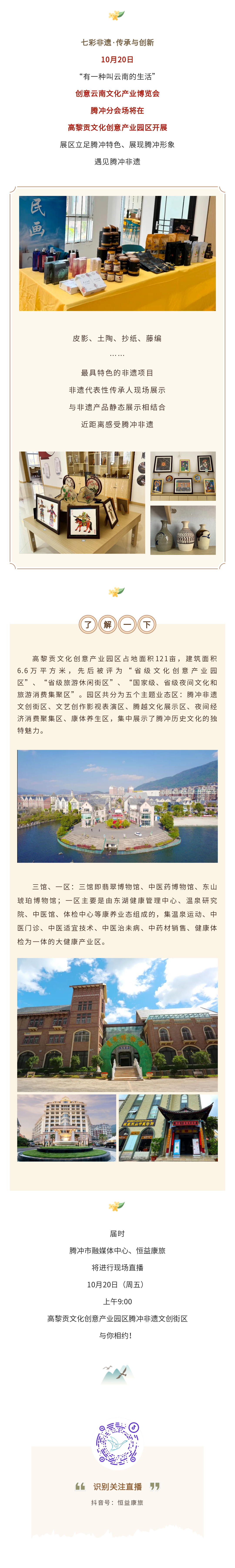 直播預(yù)熱丨文博會(huì)分會(huì)場(chǎng),相約騰沖高黎貢文化創(chuàng)意產(chǎn)業(yè)園區(qū) 來源: 瀏覽量:4280 日期:2023-10-19 分享到: 上一篇:云南文博會(huì),高黎貢文化創(chuàng)意產(chǎn)業(yè)園區(qū)展現(xiàn)騰沖多彩非遺文化 下一篇:快跟我來,帶您去逛邊交會(huì)~