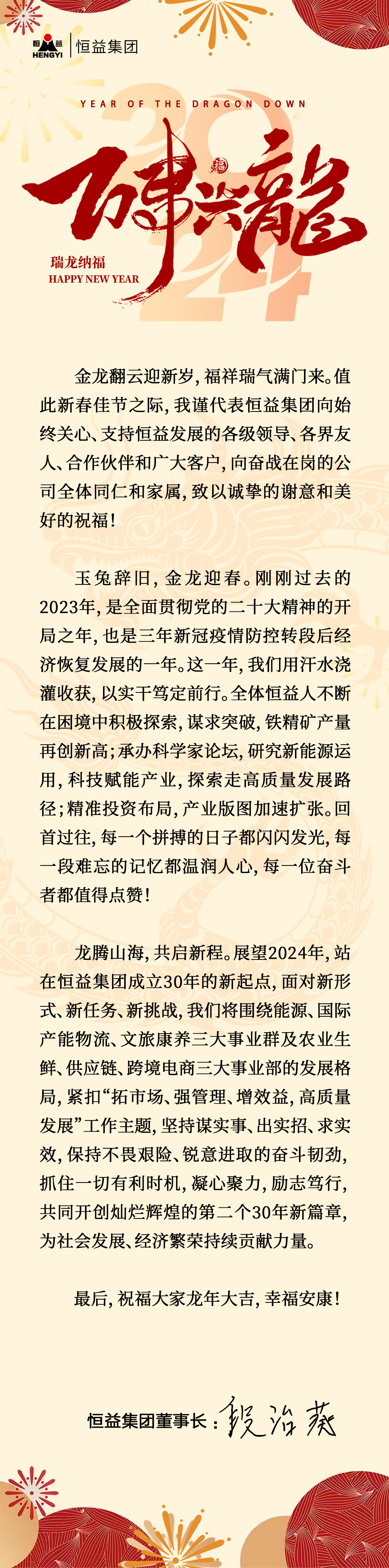 恒益集團2024年新春賀詞 來源: 瀏覽量:4519 日期:2024-02-09 分享到: 上一篇:龍騰盛世,共舞新春丨恒益集團受邀參加緬甸華僑界龍年新春慶典 下一篇:強強聯(lián)合集聚發(fā)展效能 合作共贏助力產業(yè)騰飛