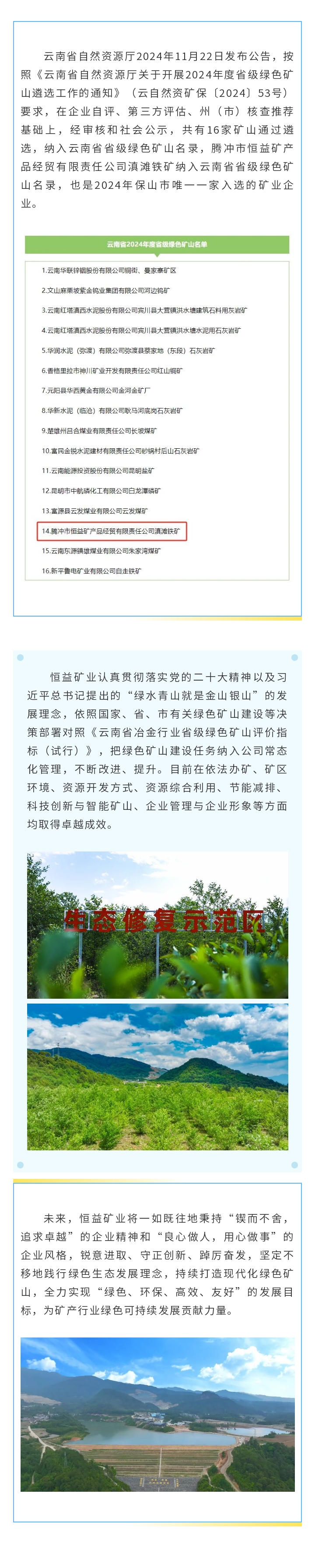 恒益礦業(yè)滇灘鐵礦成功入選云南省省級(jí)綠色礦山名錄 來源: 瀏覽量:3704 日期:2024-11-25 分享到: 上一篇:恒益集團(tuán)“薪火計(jì)劃2.0”:專業(yè)打磨與管理優(yōu)化并行,驅(qū)動(dòng)持續(xù)發(fā)展新引擎 下一篇:喜訊!恒益集團(tuán)獲得“2024云南企業(yè)100強(qiáng)”等多項(xiàng)榮譽(yù)獎(jiǎng)項(xiàng)