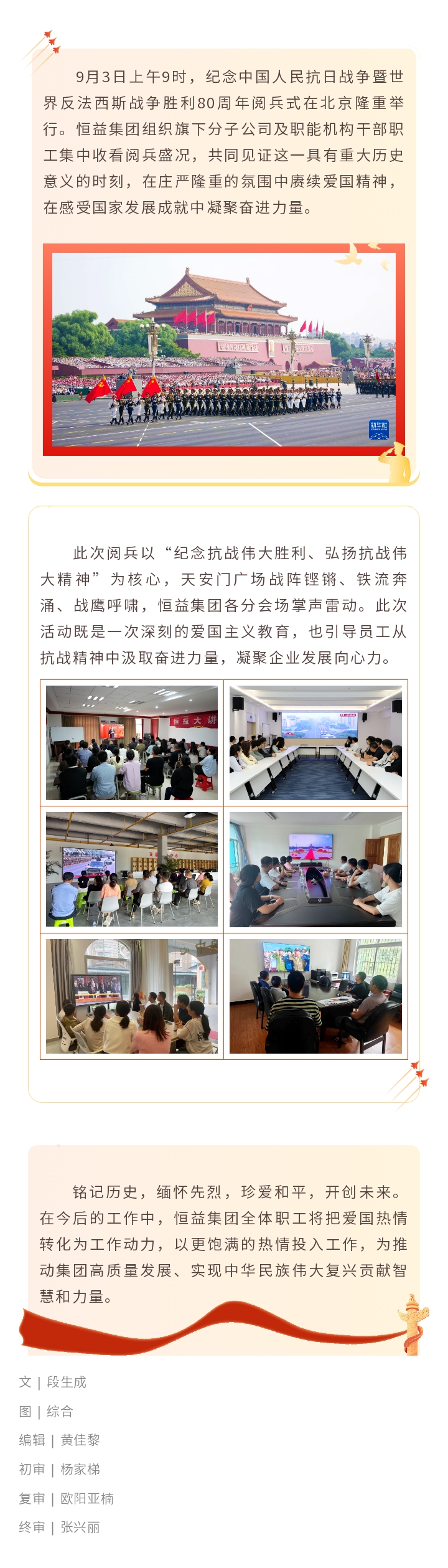 銘記榮光,凝聚力量丨恒益集團(tuán)組織集中收看抗戰(zhàn)勝利80周年閱兵盛況 來源: 瀏覽量:1208 日期:2025-09-03 分享到: 上一篇:恒益集團(tuán)濱鯤中智與猴橋鎮(zhèn)簽約 共筑高原高端淡水魚養(yǎng)殖基地 下一篇:恒益集團(tuán)受邀參加“緬甸·中國經(jīng)濟(jì)合作促進(jìn)交流會”,簽署兩項(xiàng)合作諒解備忘錄