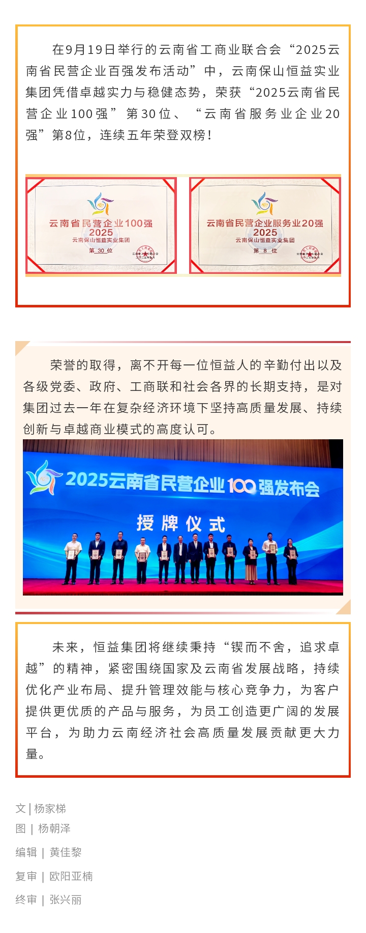 榮登雙榜!恒益集團(tuán)榮獲2025云南民企百?gòu)?qiáng)第30位、服務(wù)業(yè)20強(qiáng)第8位 來(lái)源: 瀏覽量:1409 日期:2025-09-19 分享到: 上一篇:恒益集團(tuán)開(kāi)展高管刑事法律風(fēng)險(xiǎn)防范與合規(guī)體系建設(shè)專項(xiàng)培訓(xùn) 下一篇:恒益集團(tuán)與省心說(shuō)科技達(dá)成合作 共筑微信電商新生態(tài)