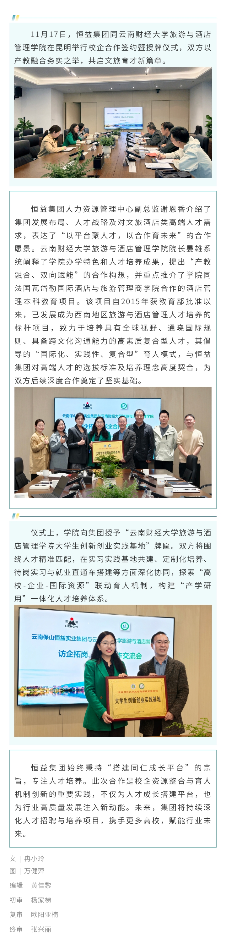 恒益集團(tuán)與云南財經(jīng)大學(xué)簽約授牌 共啟文旅育才新篇章 來源: 瀏覽量:495 日期:2025-11-18 分享到: 上一篇:恒益集團(tuán)與大理大學(xué)共建實踐基地 開啟產(chǎn)教融合新篇章 下一篇:恒益集團(tuán)“薪火計劃3.0”視頻創(chuàng)意大賽公開評審圓滿落幕 以創(chuàng)意賦能產(chǎn)品傳播